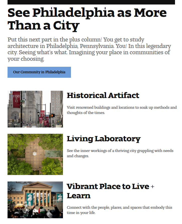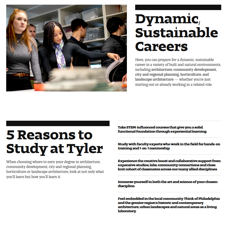 Based on existing content, detailed faculty surveys, and some 1-on-1 interviews with subject matter experts, I distilled critical information into functional and inspiring website content (majority of academic program pages) for the Tyler School of Art and Architecture website update in 2025. This required shaping content across multiple disciplines for different types of prospective students interested in vastly different types of degree programs. The samples below represent a few excerpts. The writing needed to make the most of the school’s new design template, so I encourage you to look at the live site to see how the words worked within specific graphic design spaces.