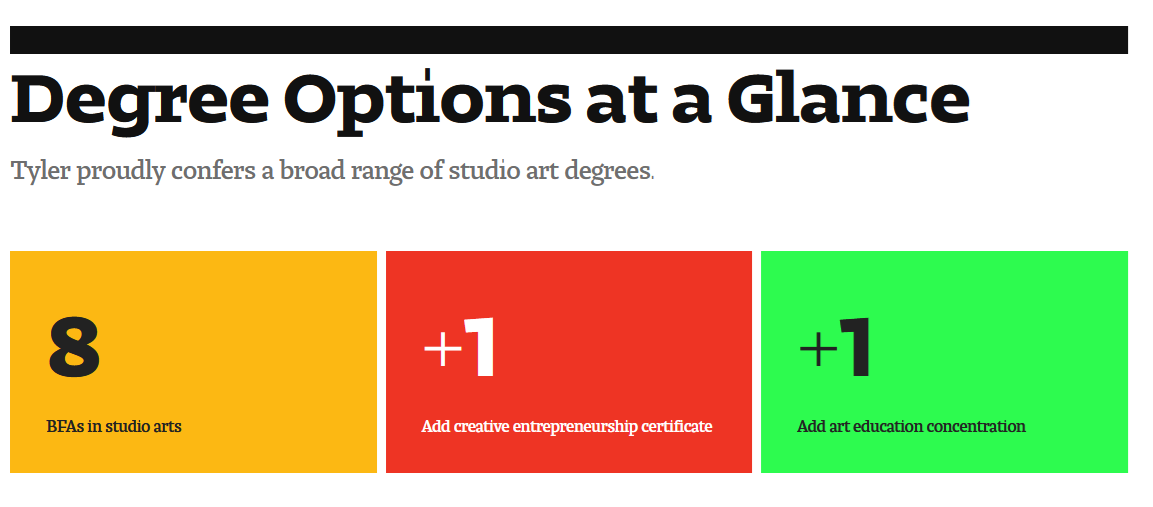 Sometimes, websites need to convey a lot of information in the simplest possible way. That’s when infographics come into play. Here’s an example that recaps all of the studio art degree programs and other bonus academic options in 3 quick stats. Pro Tip! It’s much harder to write short content.