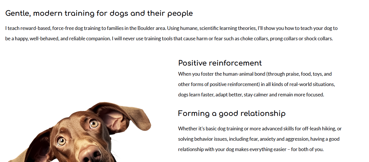 I also enjoy writing websites for small businesses and solopreneurs. Check out these excerpts from a site I wrote for my own dog trainer. The content was so good that another marketing firm or writer stole all of the content for another dog trainer in our community. All. Of. It. We had to contact them and request they take the plagiarized content down.